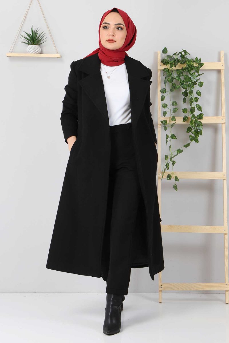 Tesettür Dünyası Siyah Beli Kuşaklı Kaşe Kaban