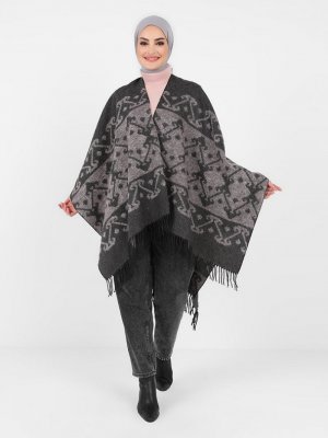 Tavin Gri Çift Yönlü Püskül Detaylı Desenli Panço