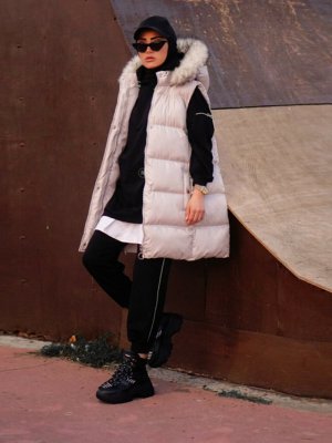 Minel Gri Kapüşonu Kürk Detaylı Yelek