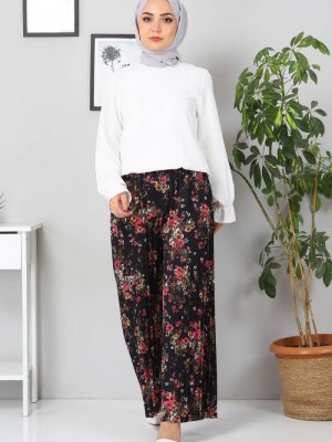 MISSVALLE Siyah Çiçekli Piliseli Pantolon