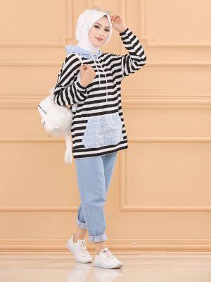 Tofisa Mavi Kapüşonlu Çizgi Desenli Tunik