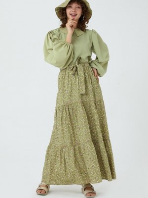 Ceylan Otantik Yeşil Küçük Çiçek Kat Kat Etek