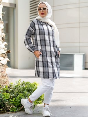 Por La Cara Füme Yandan Çift Cepli Ve Boydan Düğmeli Oduncu Ekose Gömlek Uzun Tunik