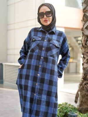 Por La Cara İndigo Çift Cepli Yırtmaçlı Boydan Düğmeli Oduncu Gömlek Uzun Tunik