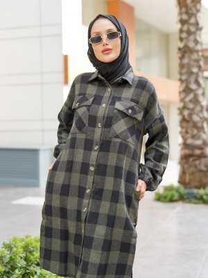 Por La Cara Haki Çift Cepli Yırtmaçlı Boydan Düğmeli Oduncu Gömlek Uzun Tunik