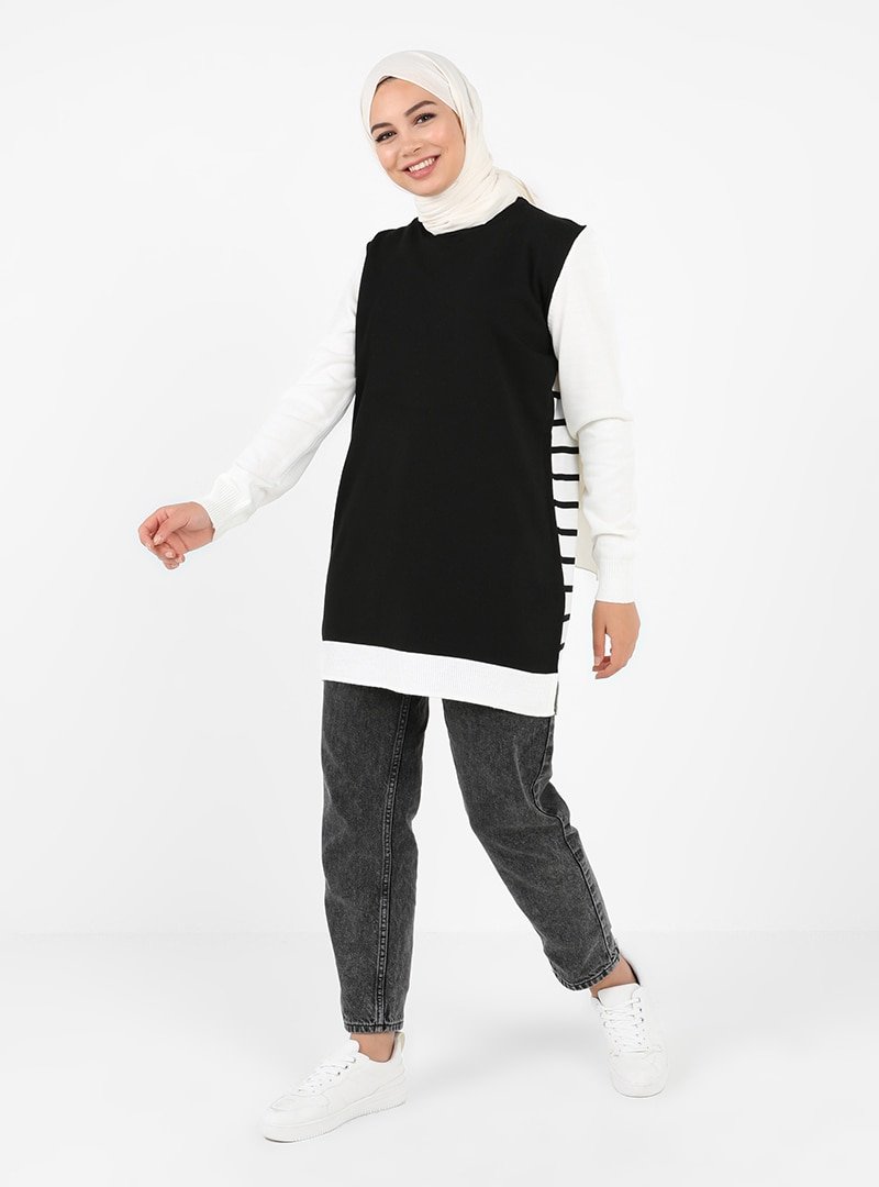 Tavin Siyah Bisiklet Yaka Arkası Çizgi Detaylı Triko Tunik