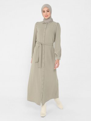 Refka Koyu Soft Yeşil Kuşaklı İnci Detaylı Aerobin Elbise