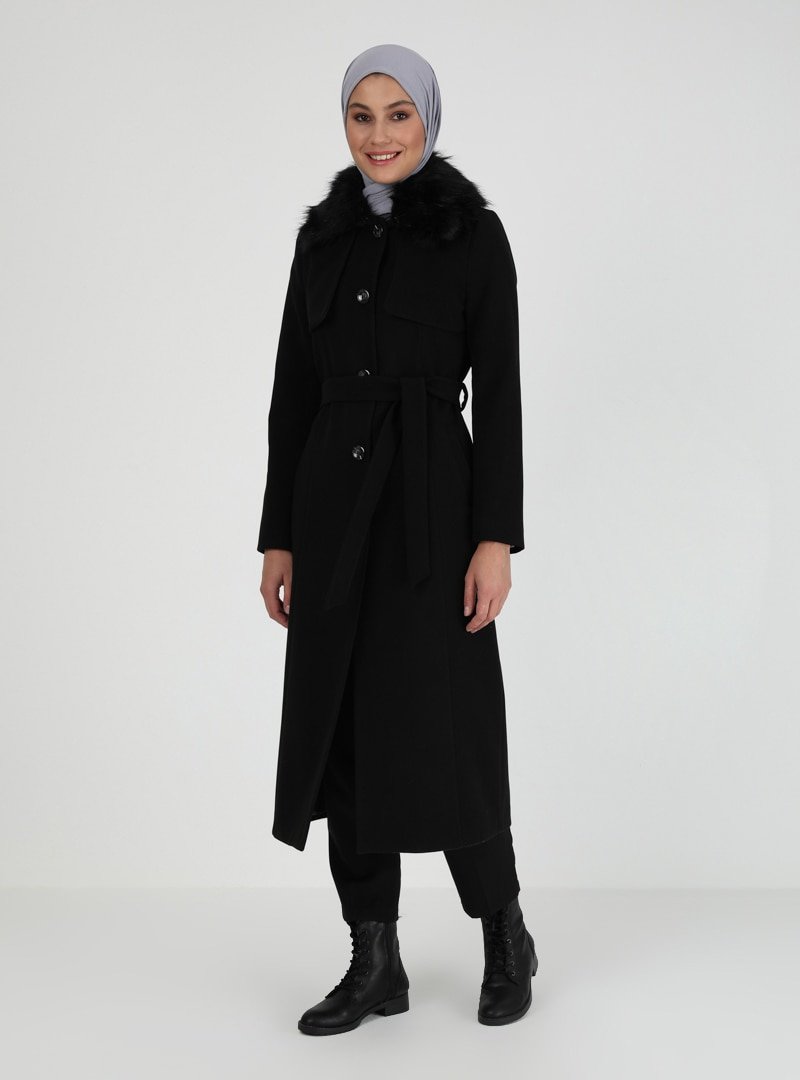 Olcay Siyah Kürk Detaylı Kaban