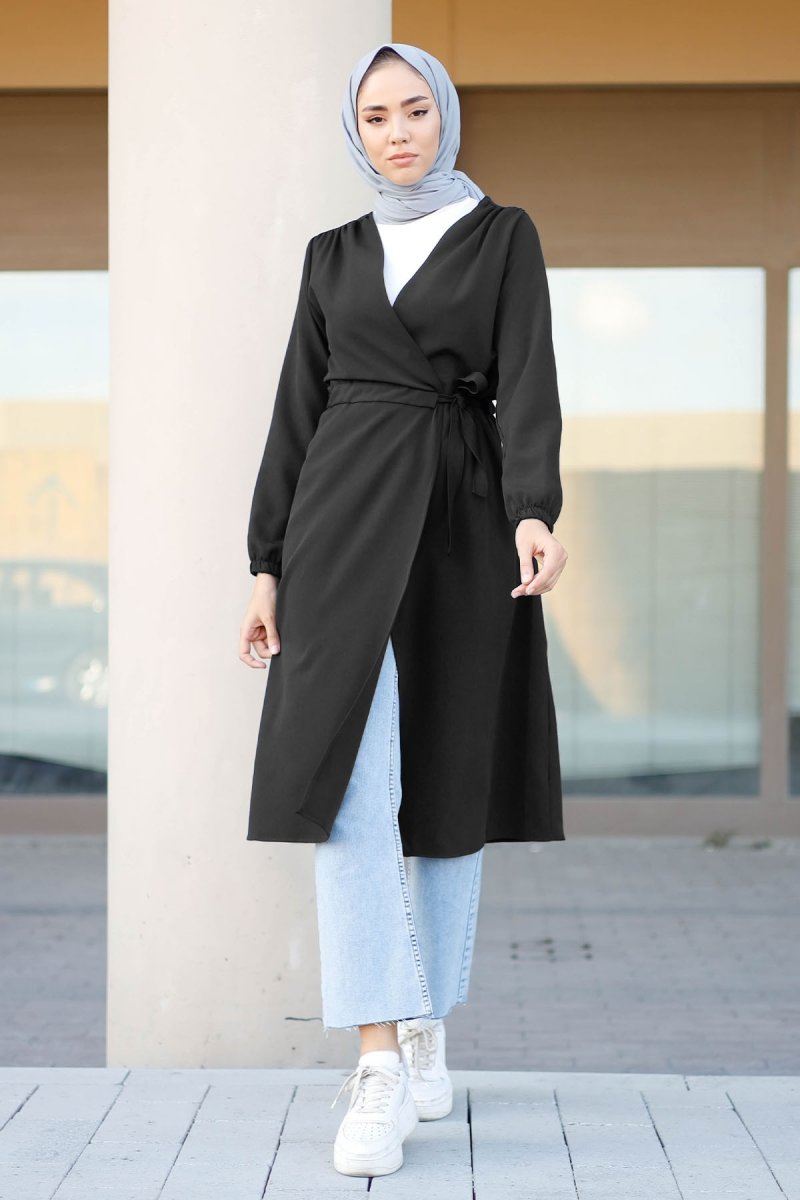 In Style Siyah Belden Büzgülü Yandan Bağlamalı Trenç