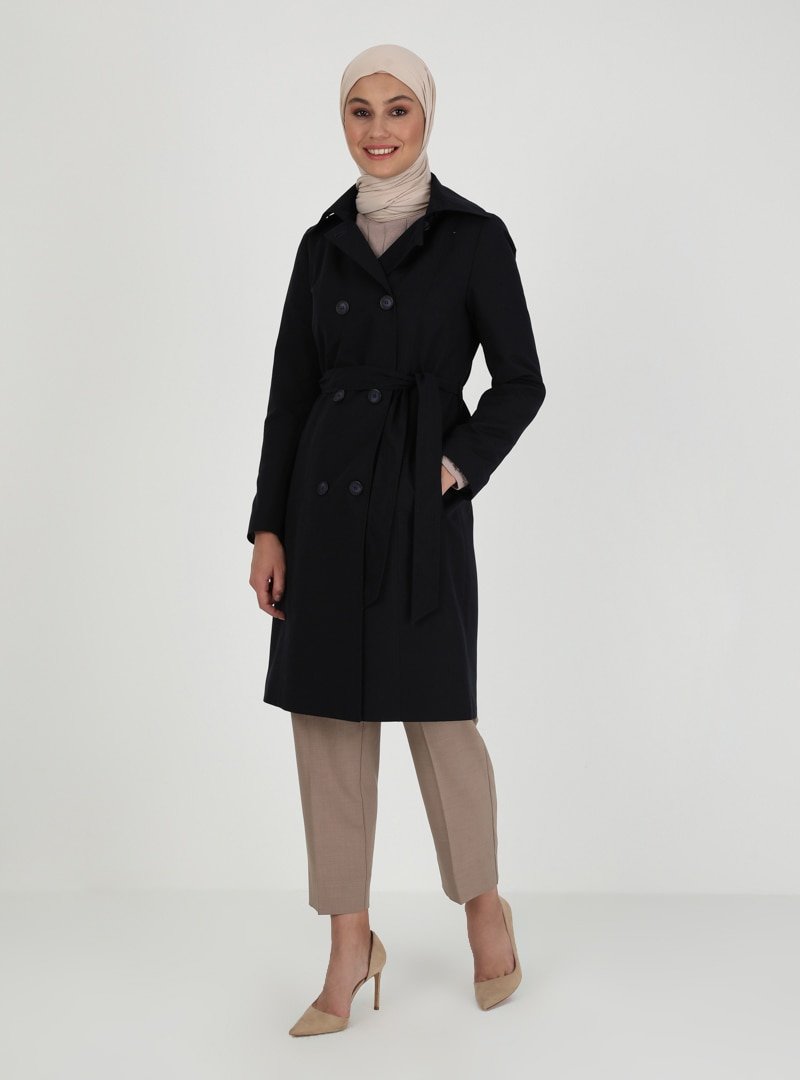 Olcay Koyu Lacivert Kapüşonlu Düğme Detaylı Trençkot