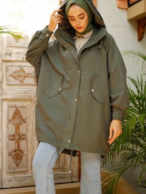 In Style Haki Yanları Çıtçıtlı Düğmeli Salaş Trenç