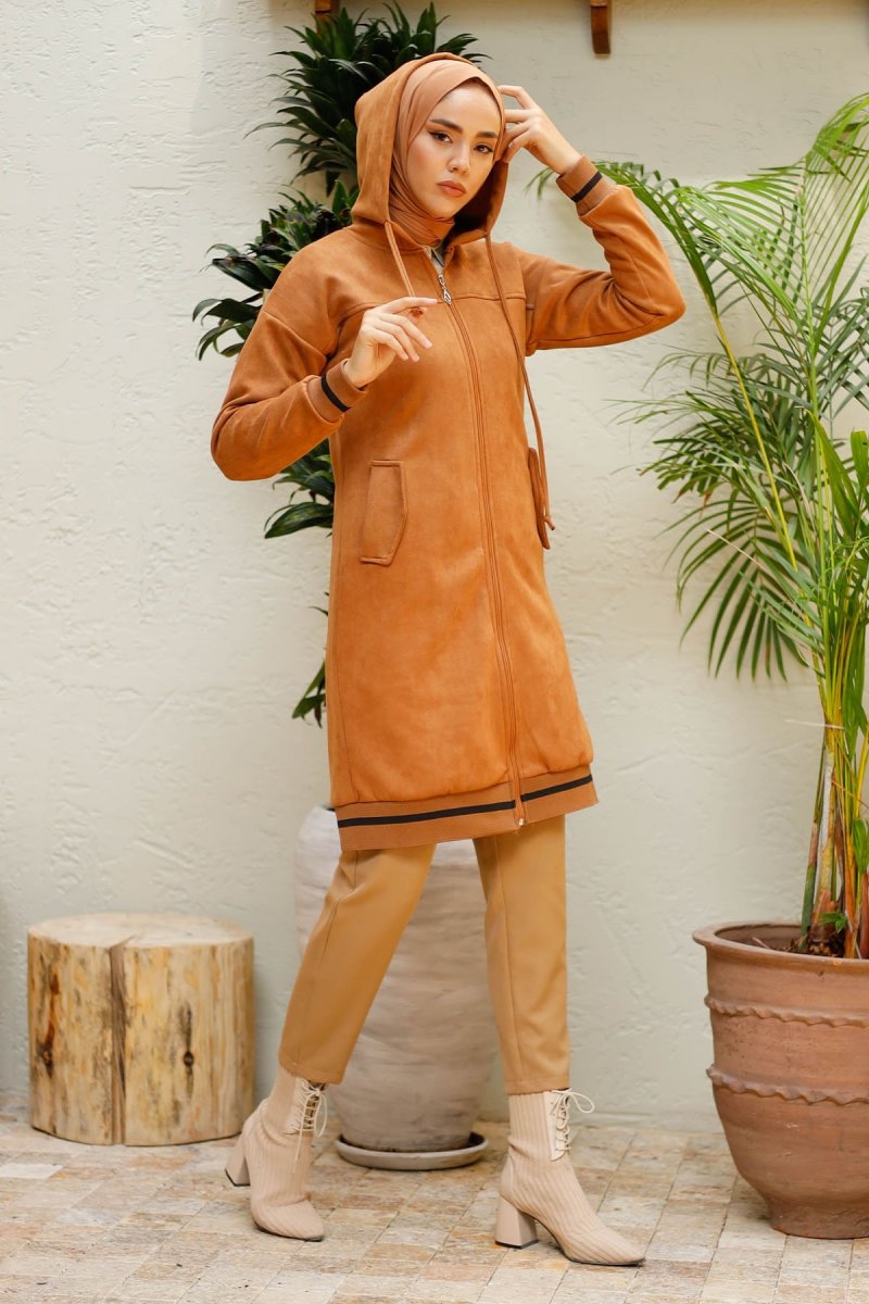 In Style Taba Süet Kapüşonlu Fermuarlı Kap