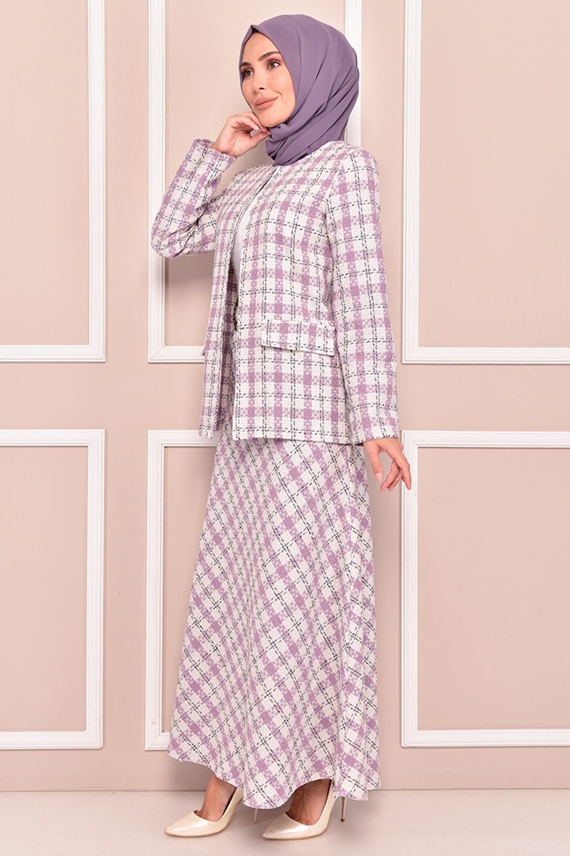 Moda Merve Lila Ekose Desen Etekli Kombin