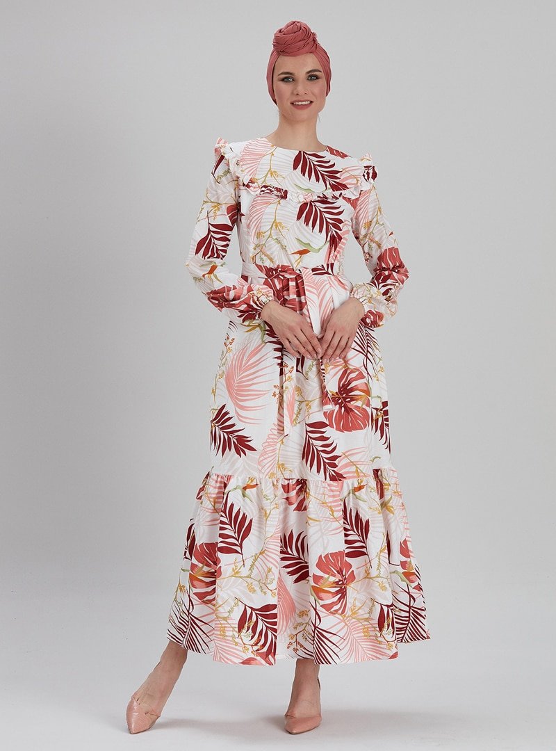 EBRAR Gül Kurusu Yaprak Desenli Elbise