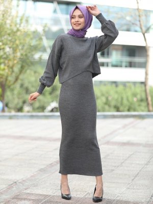 Tekbir Antrasit Pileli Triko Elbise