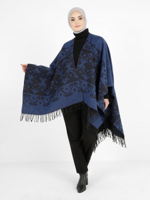Tavin Saks Mavisi Çift Yönlü Püskül Detaylı Desenli Panço