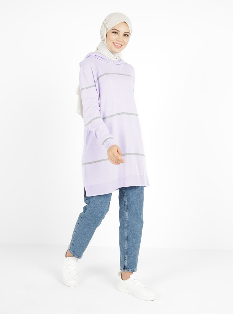 Tavin Lila Gri Çizgi Detaylı Kapüşonlu Triko Tunik