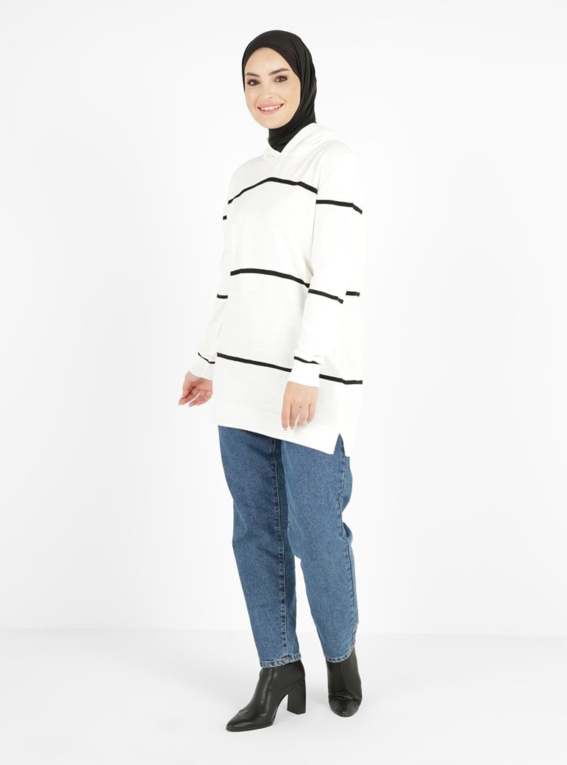 Tavin Ekru Çizgi Detaylı Kapüşonlu Triko Tunik
