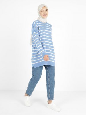 Tavin Mavi Bisiklet Yaka Çizgili Triko Tunik