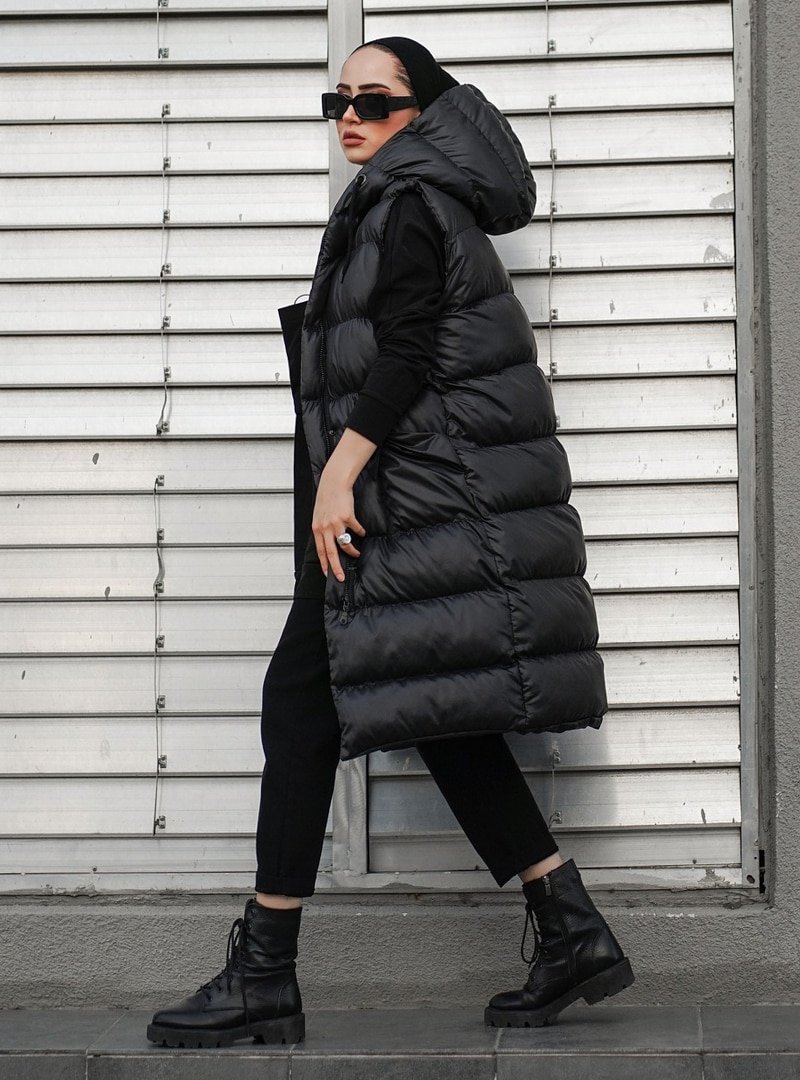 Topless Siyah Kapüşonlu Uzun Şişme Yelek