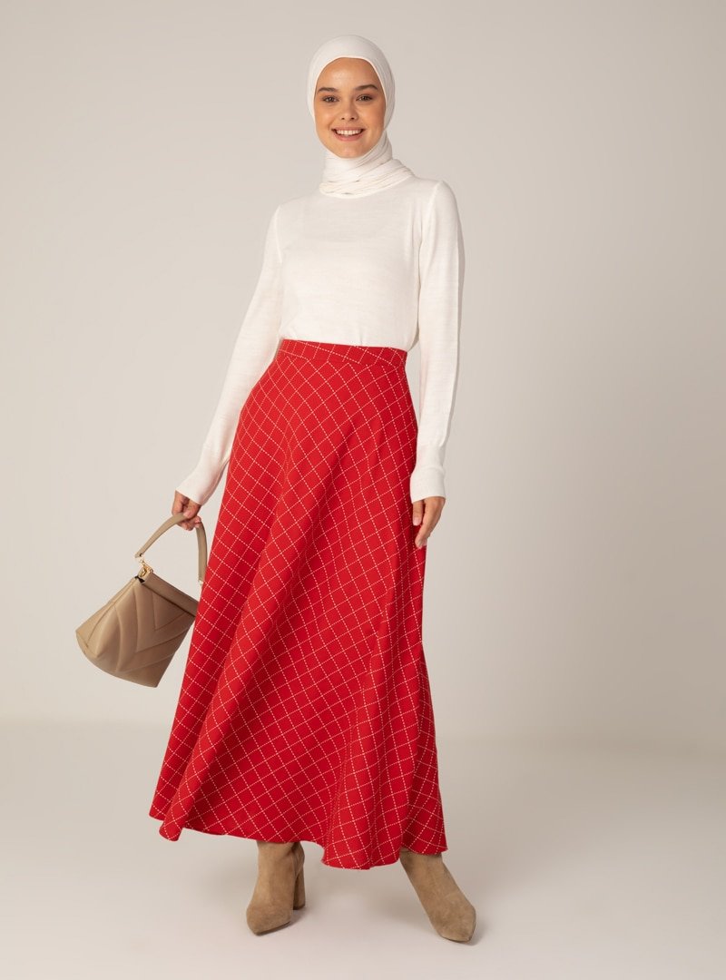 Almera Kırmızı Beyaz Desenli Etek