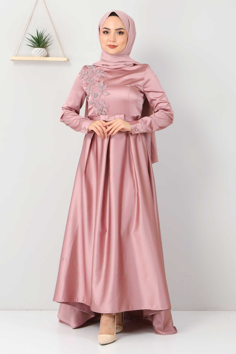 Tesettür Dünyası Gül Kurusu Taş Detaylı Saten Abiye Elbise