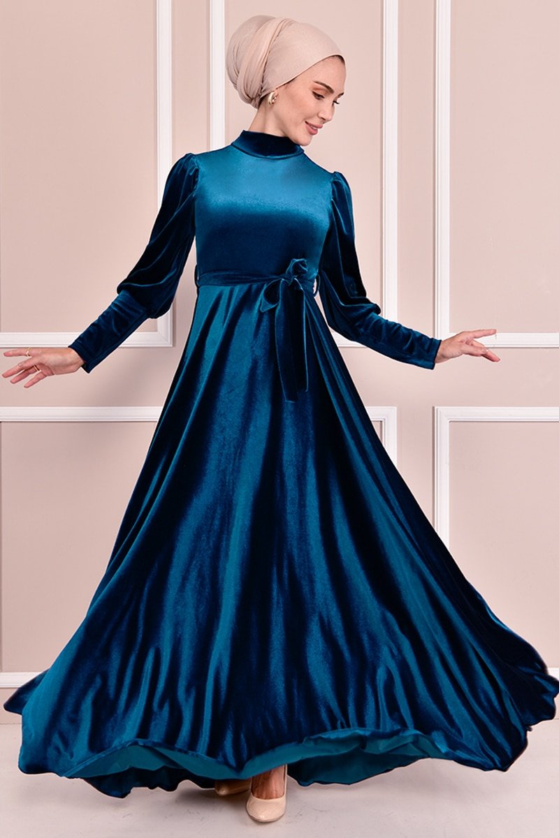 Moda Merve Petrol Kuşaklı Kadife Elbise
