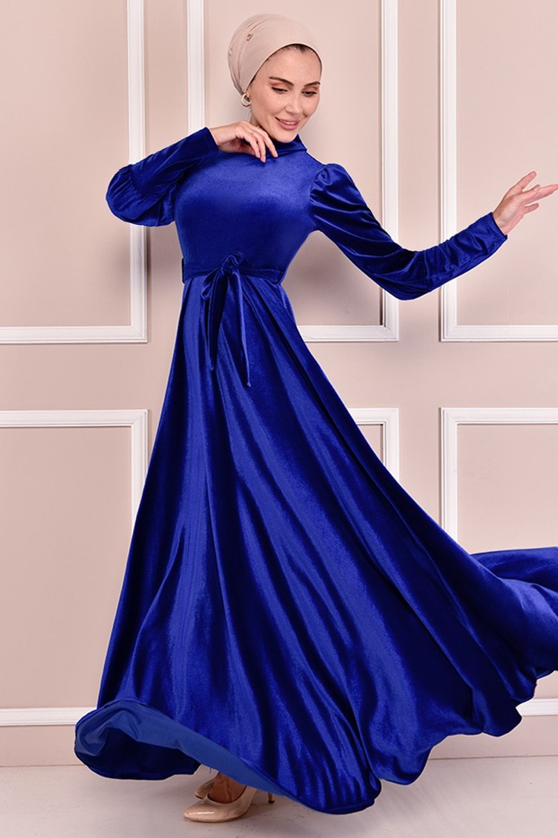 Moda Merve Saks Kuşaklı Kadife Elbise