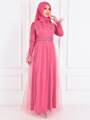 AYŞE MELEK TASARIM Koyu Gül Kemerli İncili Abiye Elbise