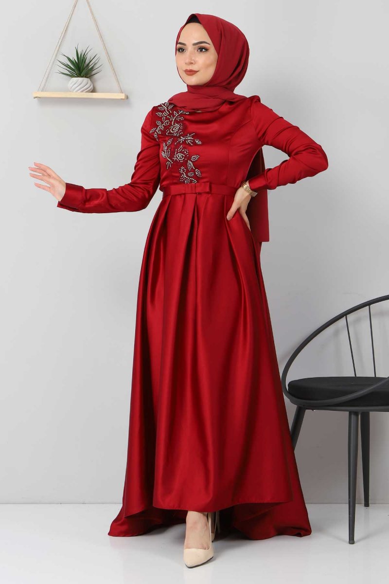 Tesettür Dünyası Bordo Taş Detaylı Saten Abiye Elbise