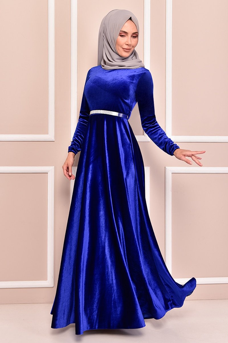 Moda Merve Saks Kemerli Kadife Elbise