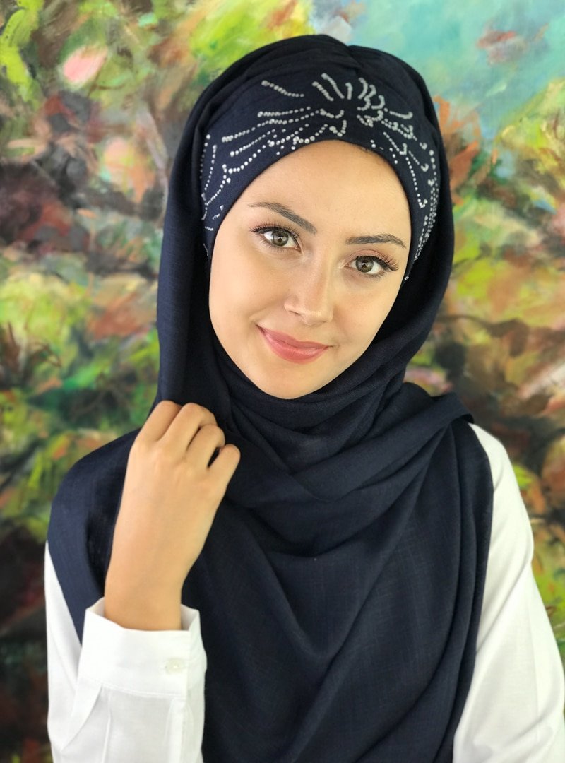 BUTİK AMBAR Lacivert Pul Baskılı Fişek Desenli Hazır Şal