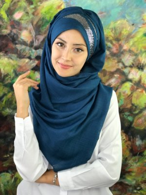 BUTİK AMBAR Petrol Pullu Payetli Asimetrik Detaylı Hazır Şal