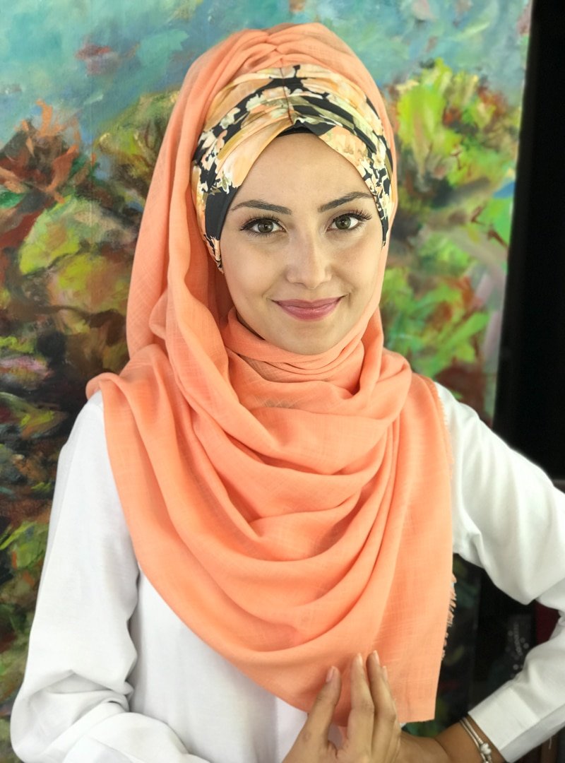 BUTİK AMBAR Çiçek Desenli Büzgülü Açık Turuncu Renkli Hazır Şal