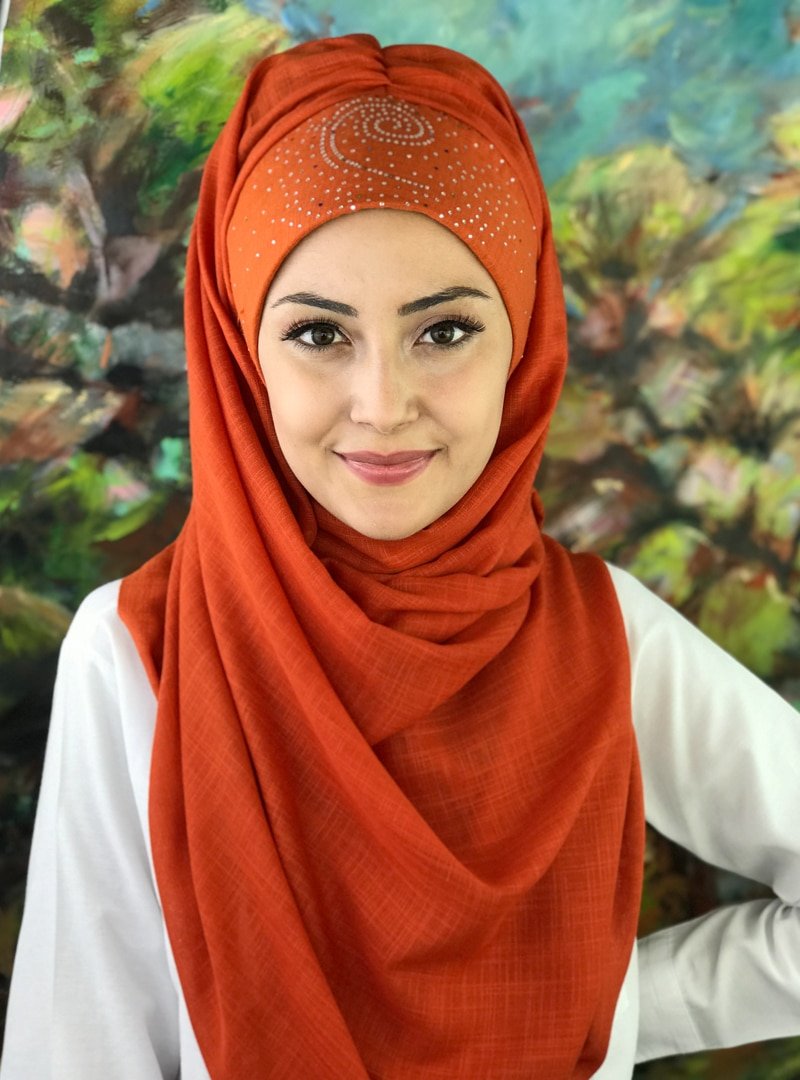 BUTİK AMBAR Gümüş Pul Baskılı Helezon Desenli Koyu Kiremit Renkli Hazır Şal