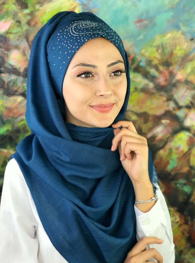 BUTİK AMBAR Koyu Mavi Pul Baskılı Helezon Desenli Hazır Şal