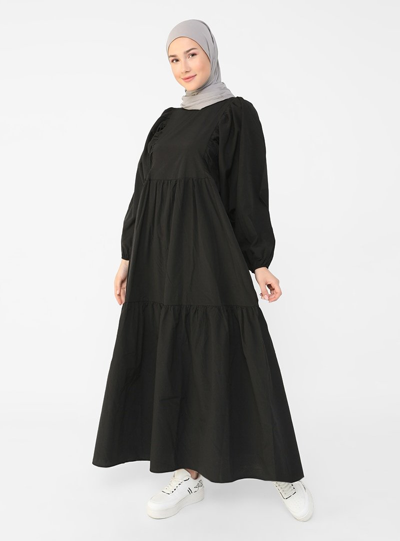 Benin Siyah Kol Uçları Lastikli Balon Kollu Poplin Elbise