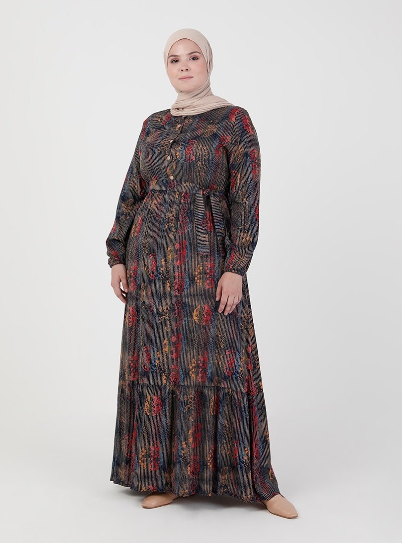 ZENANE Lacivert Beli Lastikli Desenli Elbise