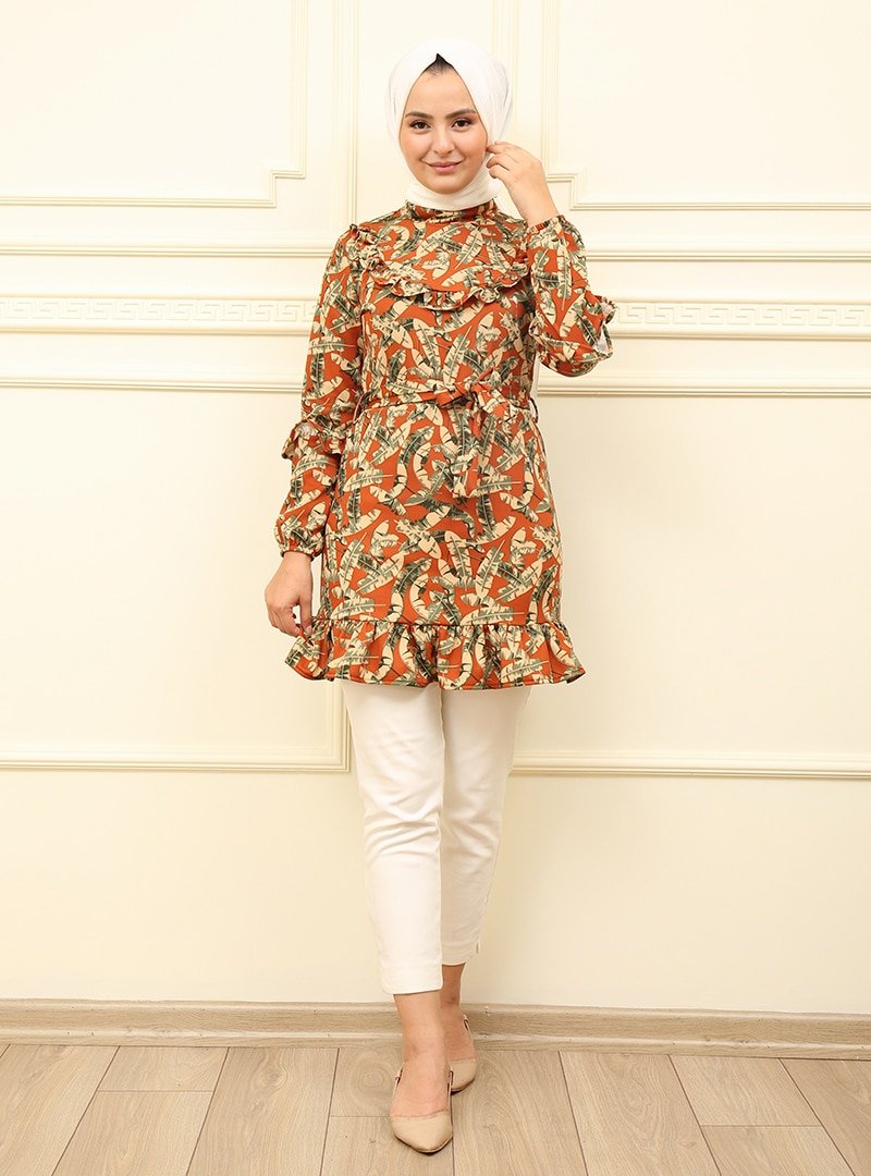 Moda Dua Kiremit Önü Fırfırlı Kolları Büzgülü Tunik