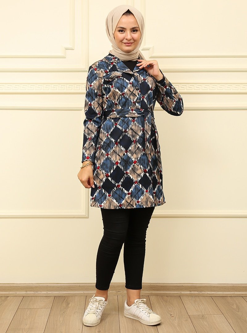 Moda Dua İndigo Yaka Düğmeli Önden Cepli Tunik
