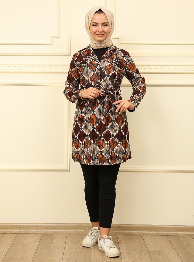 Moda Dua Kiremit Yaka Düğmeli Önden Cepli Tunik