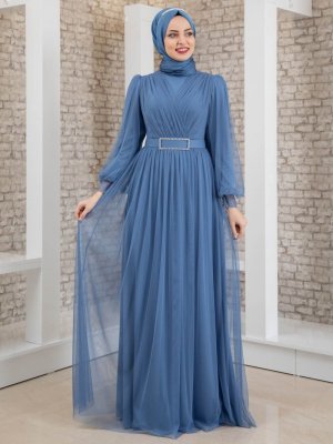 Fashion Showcase Design İndigo Taş Detaylı Tüllü Abiye Elbise