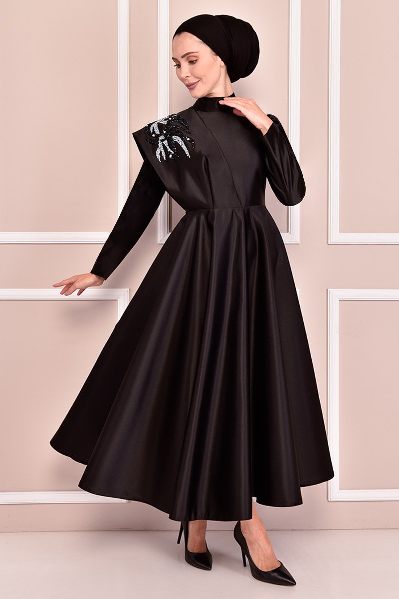 Moda Merve Siyah Saten Abiye Elbise