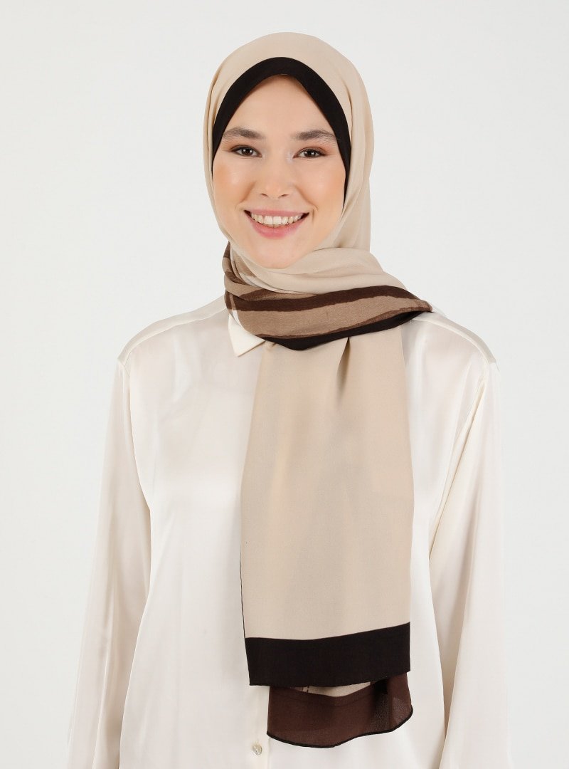 Gülsoy Krem Kahverengi Desenli Medine İpeği Şal