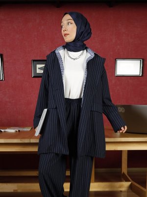 Ceylan Otantik Lacivert Çizgili Kısa Ceket