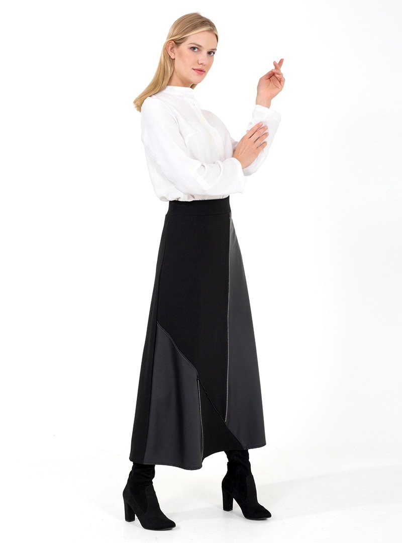 ONX10 Siyah Deri Parçalı Etek
