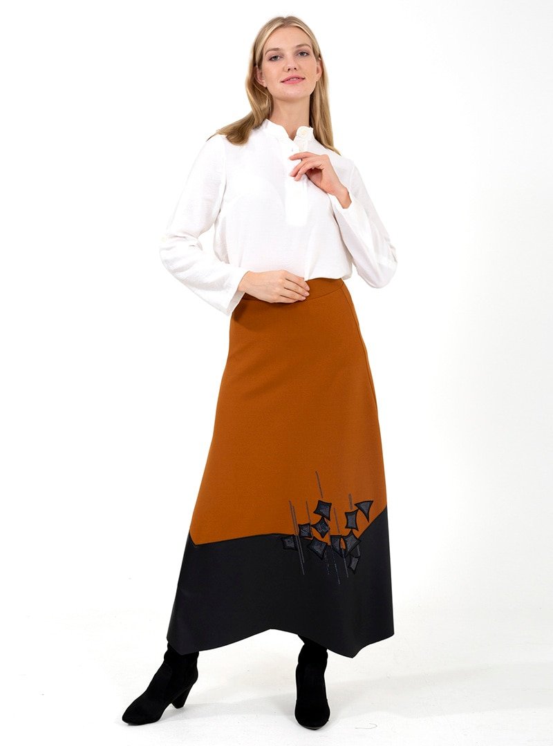 ONX10 Taba Nakışlı Deri Detaylı Etek