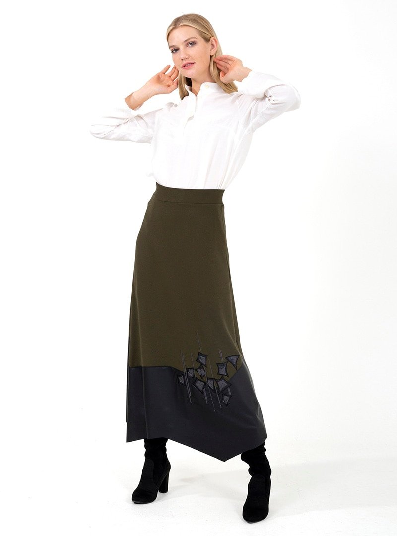 ONX10 Haki Nakışlı Deri Detaylı Etek