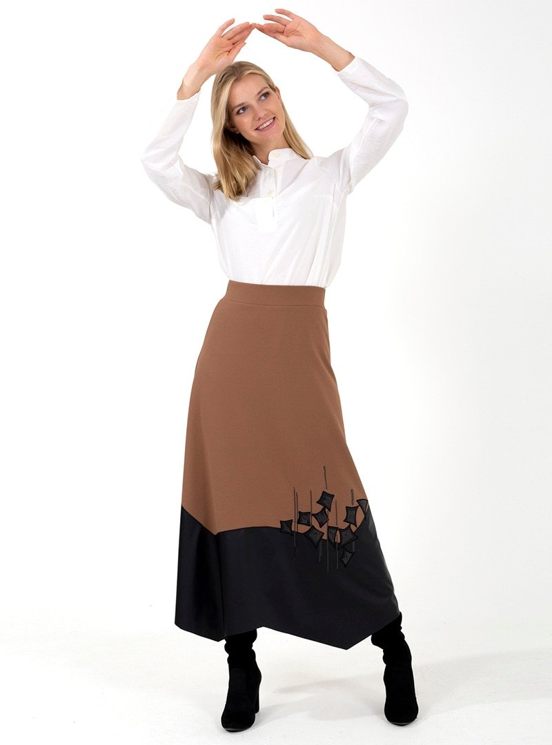 ONX10 Vizon Nakışlı Deri Detaylı Etek