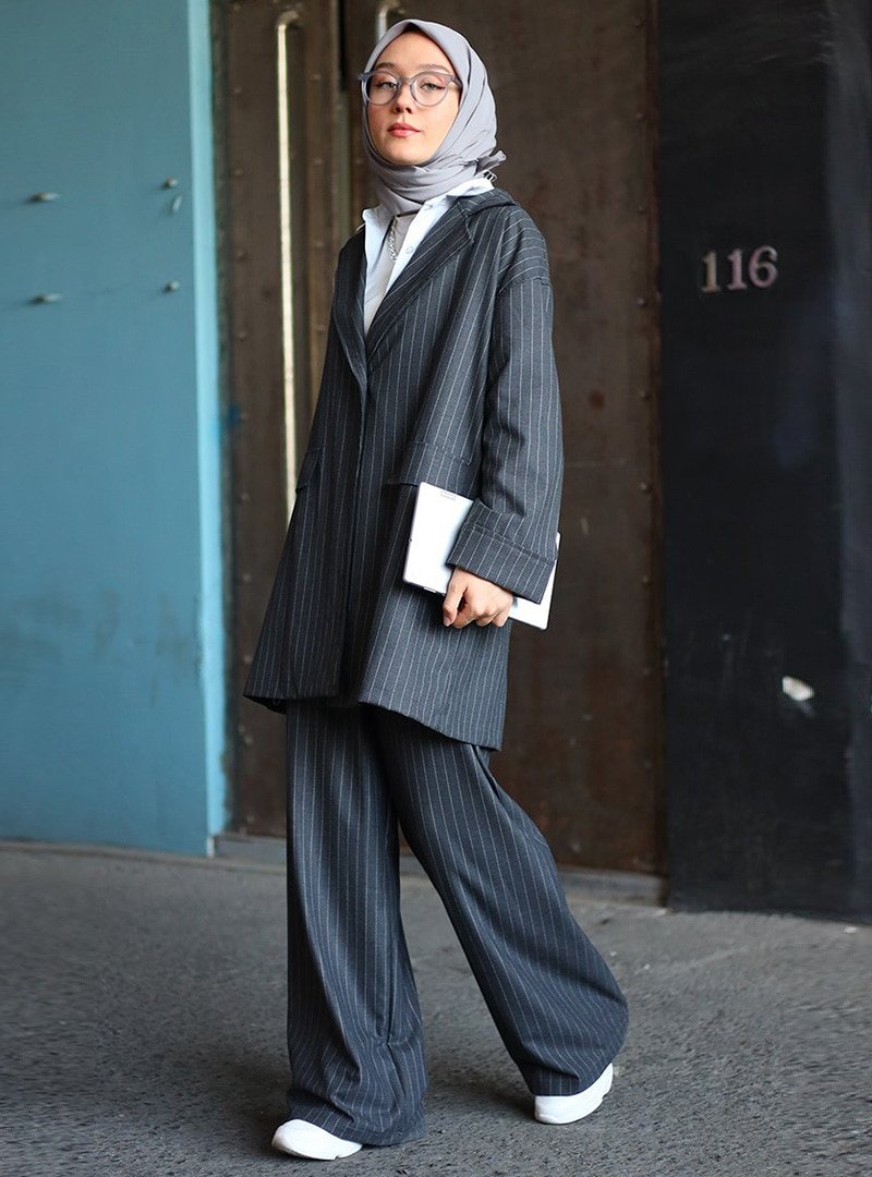 Ceylan Otantik Antrasit Çizgili Bol Paça Pantolon